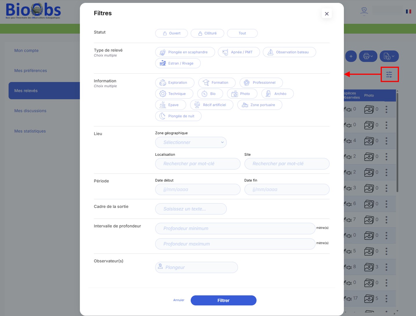 Un filtre permet de rechercher et de retrouver le ou les relevés qui répondent aux différents critères de recherche.