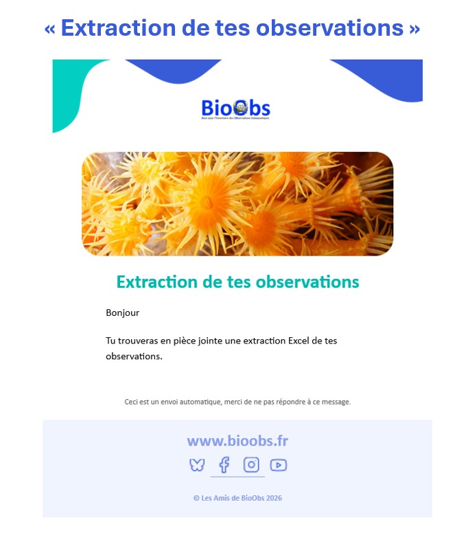 Après sélection du / des relevés de votre choix (par exemple, tous les relevés d’une même zone géographique et pour une période calendaire), vous pouvez demander l’export de vos observations : un message vous informe qu’un rapport vous sera adressé par mail dans quelques minutes.