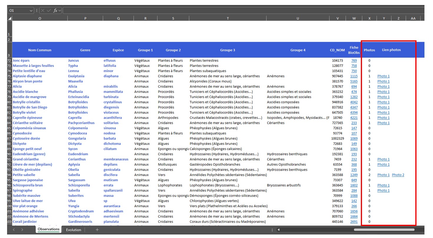 Le format de ce fichier doit répondre aux demandes de la majorité des utilisateurs de BioObs, ceux qui souhaitent partager leurs observations et leurs photos ou bien effectuer différentes recherches. Il comprend deux onglets :