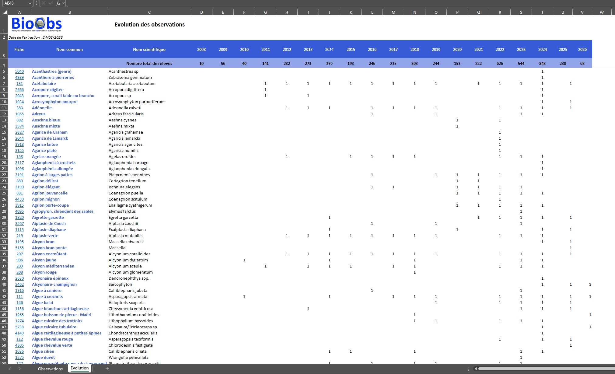 Cet onglet présente pour chaque espèce si elle a été observée (une ou plusieurs fois au cours d’une année) ou pas du tout.