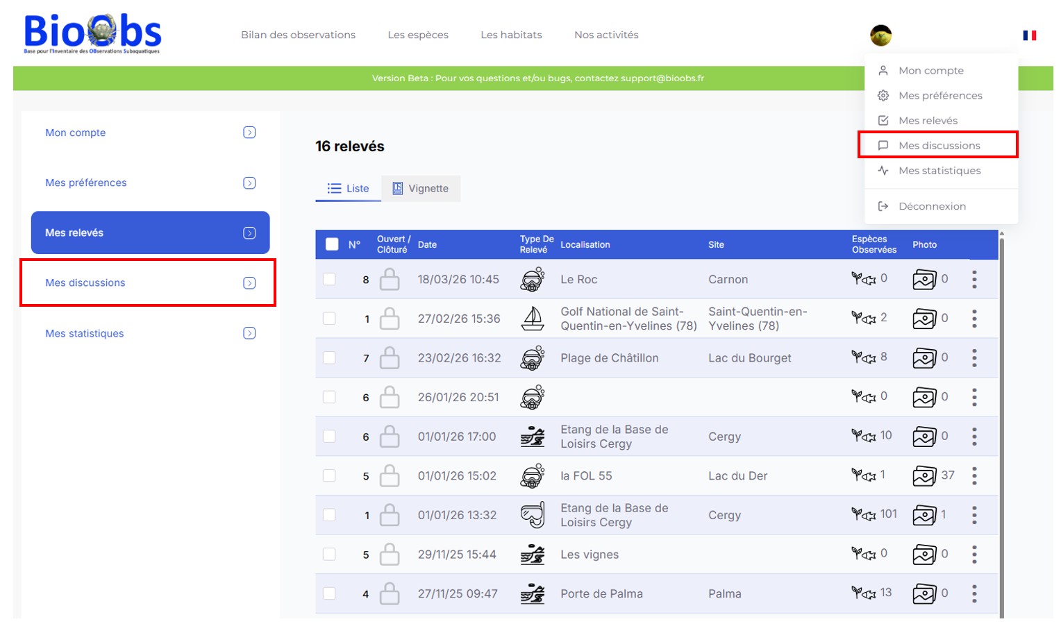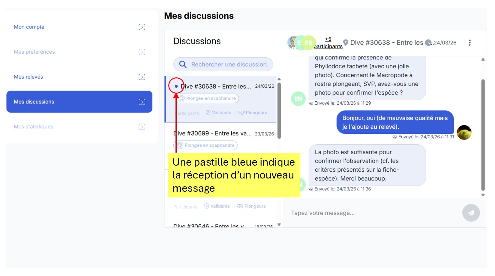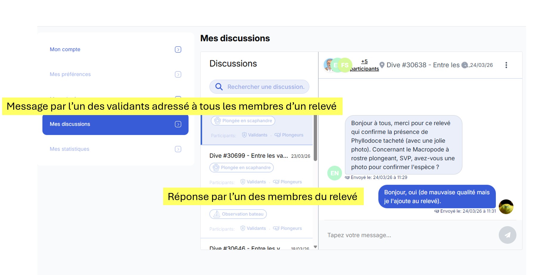 Pour permettre les échanges entre les observateurs et l’équipe BioObs en charge de la validation d’un relevé par exemple), il était indispensable de remplacer les échanges, réalisés par mail, par une solution plus moderne comme c’est le cas de la fonction « chat ».
