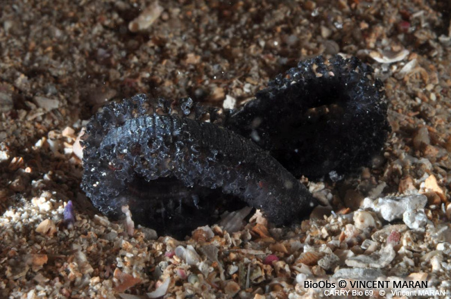Grande sangsue marine mesurant jusqu'à 10 cm : - corps est allongé, annelé et aplati ventralement, - possède deux ventouses, une à l'avant, la ventouse orale, et l'autre à l'arrière, la ventouse anale, - couleur sombre et uniforme, brune à noire-violacée, parfois ponctuée de blanc d'un brun noirâtre,Biotope / Habitat