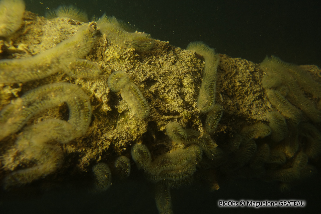 Colonie qui ressemble à une chenille translucide, gélatineuse et velue : - Taille de 20 à 40 mm de longueur, - Couleur blanc cassé à jaune clair, - 2 à 3 rangées de zoïdes, - Couronne de lophophore en forme de fer à cheval. Les colonies se déplacent lentement (quelques cm/jour, surtout les jeunes colonies). Visibles au Printemps et en Eté.Biotope / Habitat