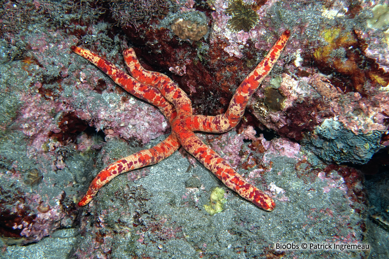 Etoile de grande taille (20 à 30 cm de diamètre) : - Cinq bras cylindriques longs et fins, - Disque central de taille réduite, - Epiderme lisse sans granulation, - Disque et bras marbrés de couleur crème, jaune, rouge-brun ou rouge vif.Biotope / Habitat