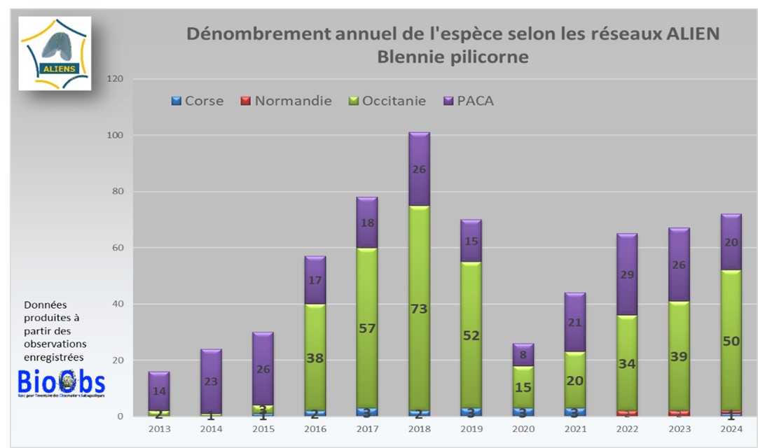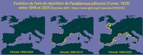 Sur la base des évolutions de l’aire répartition de cette espèce (cf. carte du GBIF), il apparait que la Blennie pilicorne est maintenant bien observée dans les réseaux ALIEN Occitanie et ALIEN PACA.